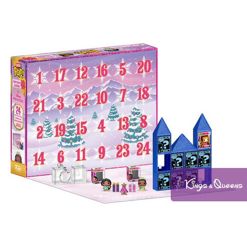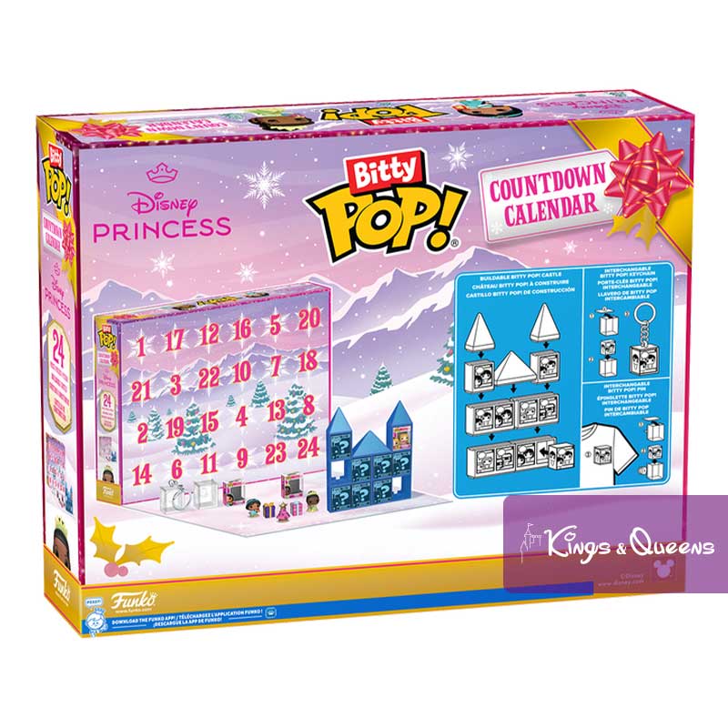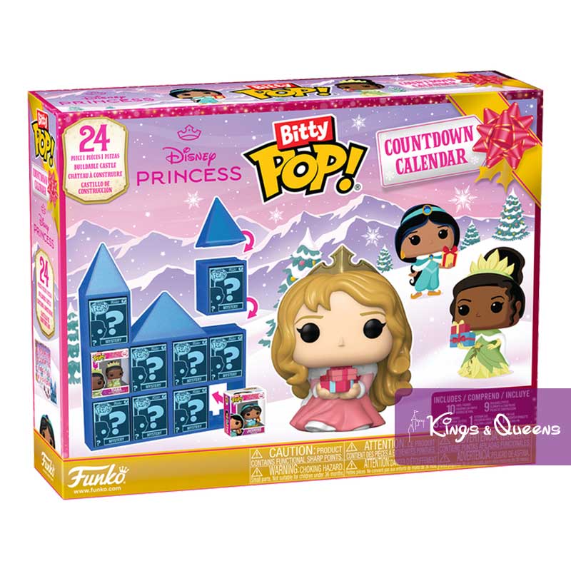 Funko Pop! Advent Countdown Calendar Disney Princess. Count down to your favorite holiday – or any special occasion – with the Disney Princess 24-day Bitty POP! Countdown Calendar! Open the little doors to discover 10 Bitty POP! collectibles, 9 stackable display pieces, 3 party accessories, 1 keychain case and 1 pin case. Expand your princess collection with this Disney Princess 24-day Bitty POP! Countdown Calendar as the next addition to your collection. The Bitty POP! collectibles are packaged in hard acrylic boxes with removable lids. The removable lids also serve as acrylic feet, to which the Bitty POP! figures are attached. Vinyl figures are approximately 2.3 cm tall. Acrylic keychain covers and acrylic pin covers are approximately 3.3 cm W x 4.1 cm H x 3 cm D and fit all standard Bitty POP! boxes. Bitty POP! keychain is approximately 7.6 cm long. Countdown Calendar Disney Princess.