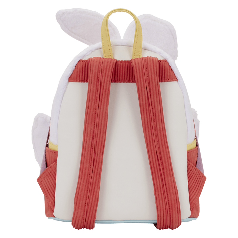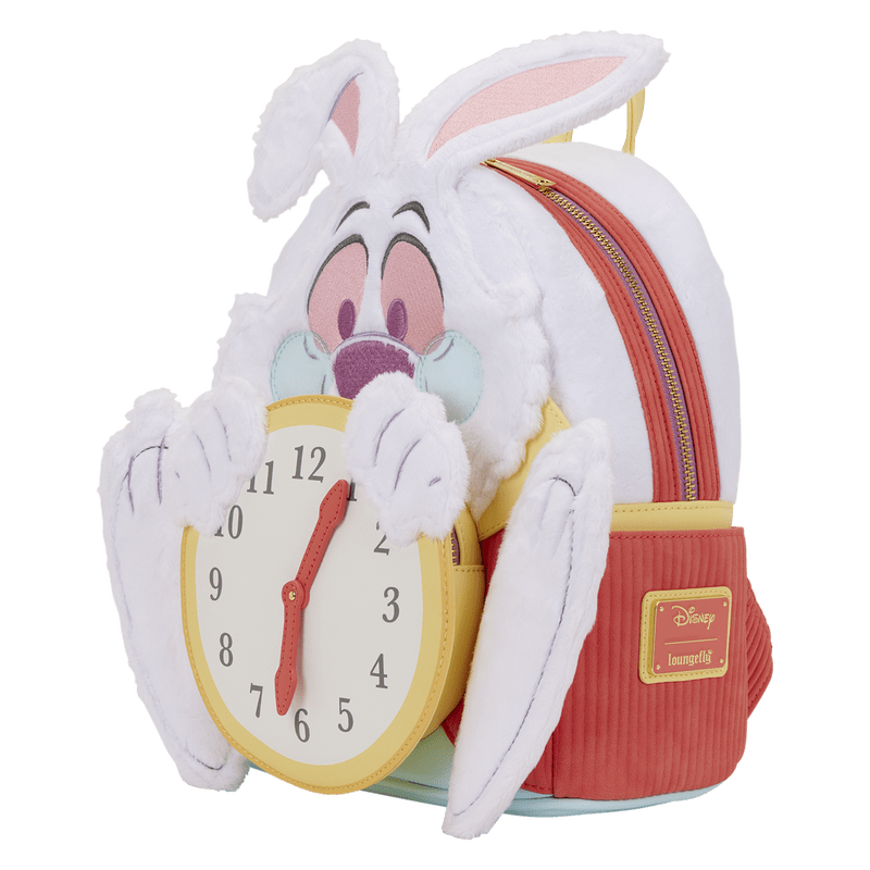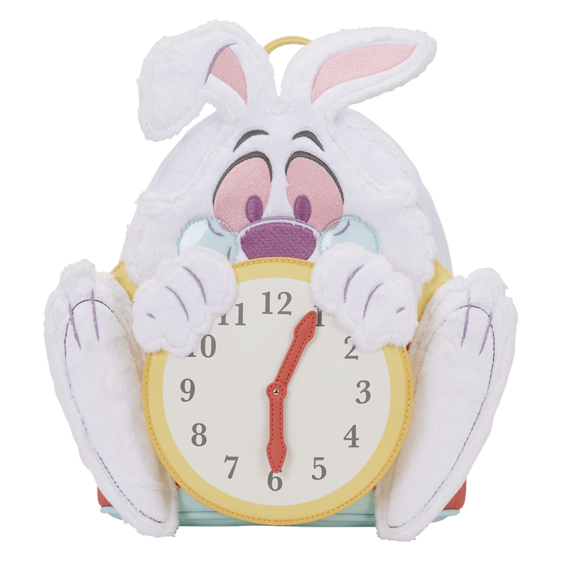 Loungefly Backpack Disney Alice in Wonderland White Rabbit. Don’t be late! This mini backpack is ready for any important date! It features the White Rabbit from Disney’s Alice in Wonderland. You’ll find faux fur, embroidered facial details, PVC, and plush details on the bag to bring the rabbit to life. He holds a clock, and the hands spin on a rivet! Fall down the rabbit hole of style! Features: Plush and pleated-polyurethane mini backpack with polyurethane trim; Sturdy top handle; Adjustable shoulder straps; Applique, embroidered, faux fur, PVC, spinning rivet, and printed details. Coordinating interior lining This Loungefly Backpack White Rabbit is an officially licensed Disney product.