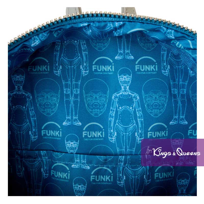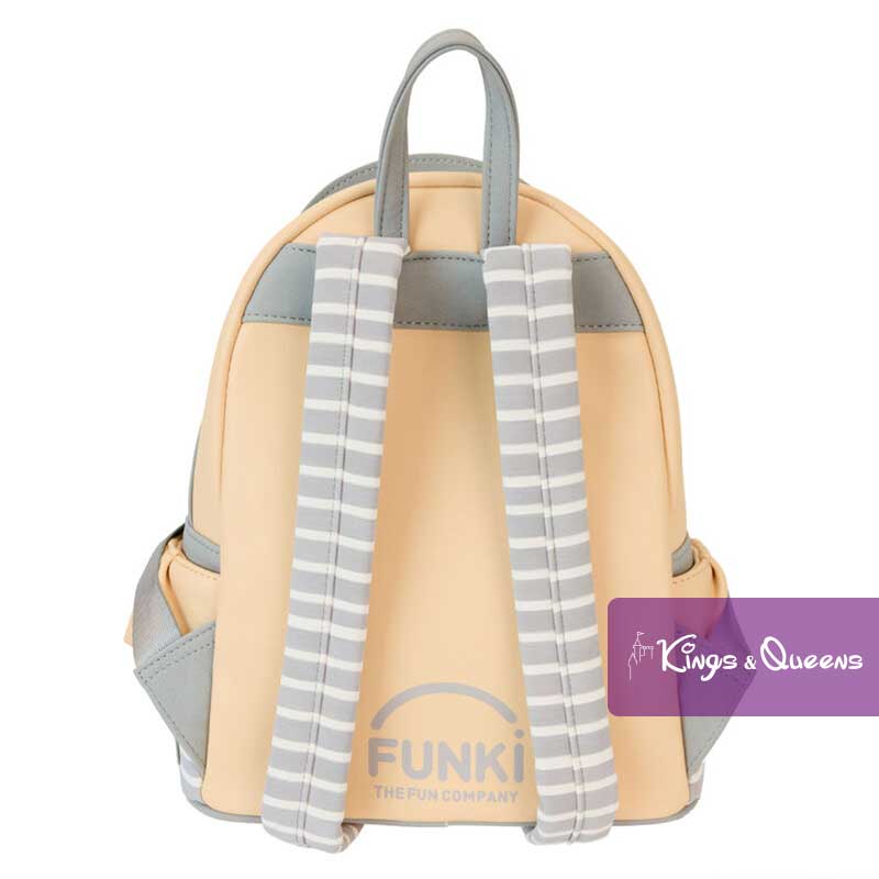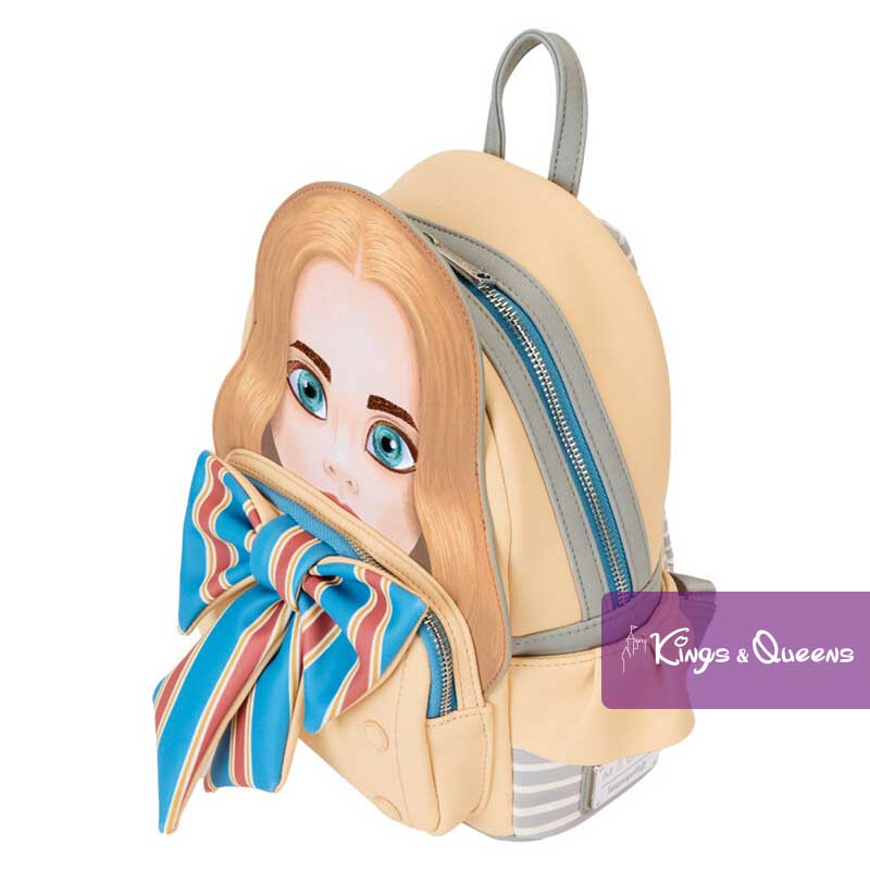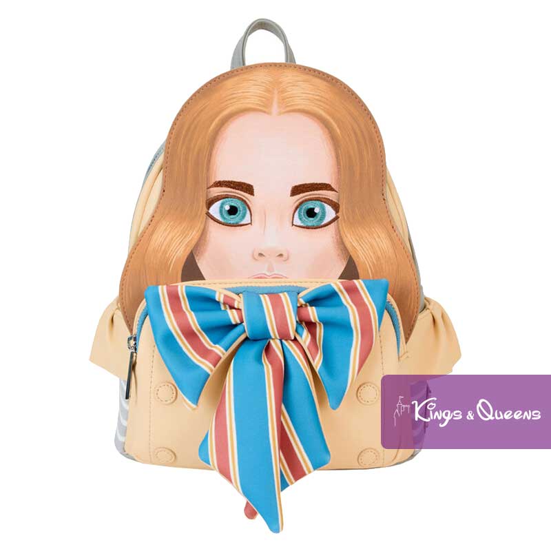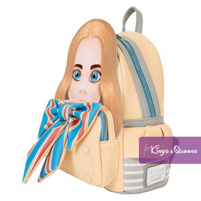 Loungefly Backpack M3GAN. Put your creepy-chic dance moves to work. Our M3GAN backpack is perfect for creating a great look anywhere. This cream-colored backpack is inspired by M3GAN’s outfit with her signature gold, red and blue bow as a 3D applique on the front pocket. Her appliqued hair and face realistically stand out. On the back you will find the “Funki” logo. Pack your daily essentials and go on an adventure in terrifyingly fun company. Features: Vegan leather (polyurethane); Padded, adjustable shoulder straps with gray and white stripes; Side pockets with cream-colored applique “ruffles” and gray and white stripes; Main zippered pocket for secure storage; Front zippered pocket for storing smaller items; Silver-tone metal hardware; Appliqué, 3D bow, embroidery and printed details. Coordinating inside lining. This Loungefly Backpack M3GAN is an officially licensed product of Universal City Studios.