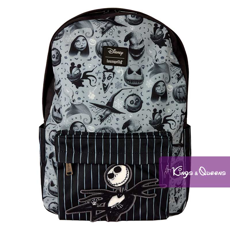 Loungefly Backpack Nightmare Before Christmas Nylon Full-Size. Wat dacht je van een vleugje Halloween Town?! Deze full-size rugzak is een eerbetoon aan ieders favoriete Pompoenkoning! Je vindt Jack Skellington op het voorvak tegen een zwart-wit gestreepte achtergrond. Over de hele voorkant van de tas vind je afbeeldingen van een aantal van je favoriete personages uit Halloween Town, waaronder Jack, Sally, Oogie Boogie en meer! Laat elke dag een van je favoriete films zien met deze full-size tas! Kenmerken: Nylon full-size rugzak; Appliqué en bedrukte details; Stevige handgreep; Verstelbare schouderbanden. Bijpassende binnenvoering. De Backpack Nightmare Before Christmas is een officieel gelicentieerd Disney-product.