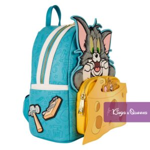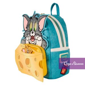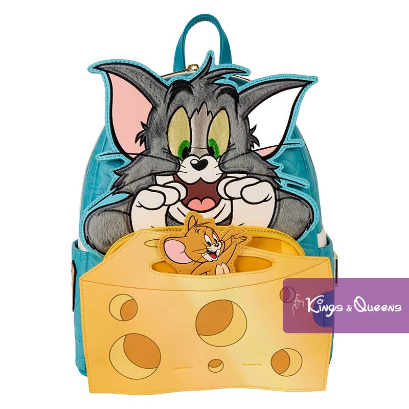Loungefly Backpack WB Tom and Jerry. Raise your hand if you love Tom and Jerry! This mini backpack celebrates this classic cartoon! On the front, you’ll find Tom in plush detail looking excitedly at a wedge of cheese, which Jerry pops out of! On the side pockets and the straps, you’ll find various tools Tom uses to try and catch Jerry, like a mouse trap, a baseball bat, and a mallet. You’ll find debossed motifs of the show all over the bag. Every outfit becomes an instant classic with this mini backpack! Features: Faux leather (polyurethane); Sturdy top handle; Adjustable shoulder straps; Applique, debossed, embroidered, patent faux leather, plush, and printed details. Jerry pops out. Coordinating inside lining. The Loungefly Backpack Tom Jerry is an officially licensed Warner Bros. product.